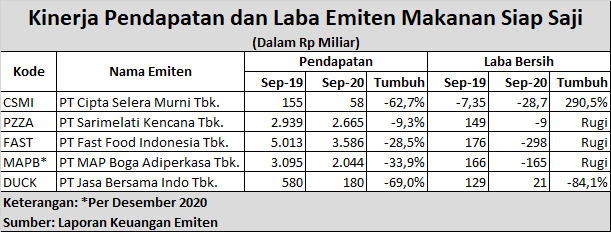 Saat ini, di pasar modal setidaknya ada beberapa emiten pengelola restoran, yakni PT Fast Food Indonesia Tbk. (FAST) untuk merek KFC, PT Sarimelati Kencana Tbk. (PZZA) untuk Pizza Hut, dan PT Cipta Selera Murni Tbk. (CSMI) untuk Texas Chicken Indonesia.